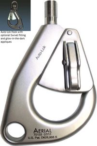 The innovative design of the Auto-Lok Hook incorporates a latch which is always locked for maximum safety. The latch has safety releases on each side which are easily depressed by a rescuer with a gloved hand, or by an untrained survivor.
